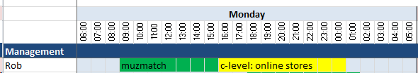 in this example image, Rob is working on muzmatch work from 09:00 - 15:00