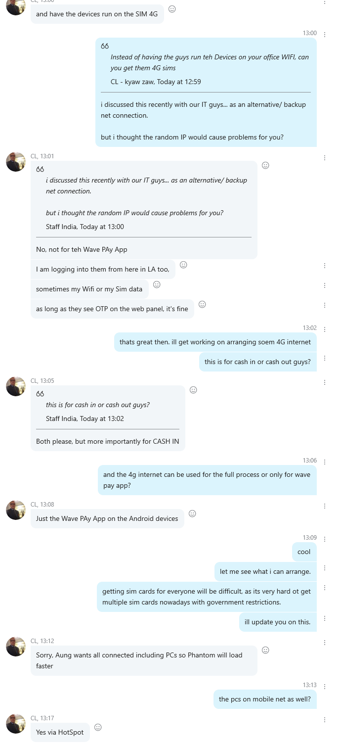 Chris provides us two 4g Grameenphone sim yesterday. Today i went to office, put 2 Sim's on 2 Android phones. I observe closely and we didn't face any issue. That means we can use mobile data to perform Aung's work (Wavepay, Cash in, Cash out).