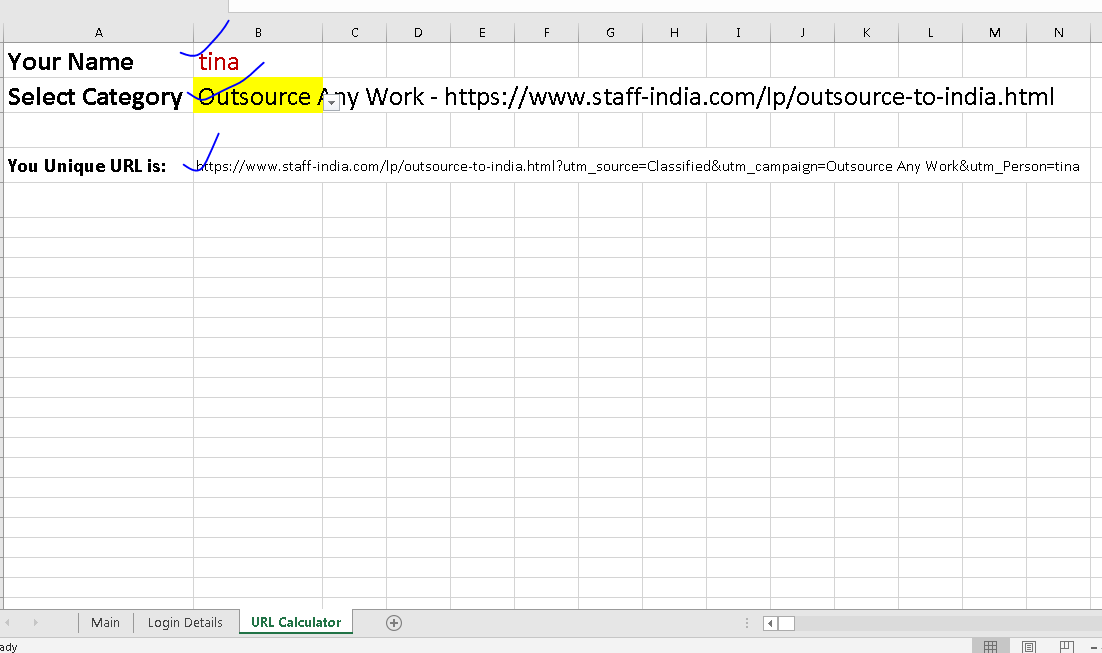 - On this sheet go to the tab name ‘URL calculator’ (see here: https://drive.google.com/open?id=17Ke3VbhaFjIe7GucpFKsd6I2PdmG3z2S), write your alias name beside the YOUR NAME cell. Then select the right category. Your category is virtual assistant/administrator. Then you will see a LINK will appear on the “your unique link is” box. COPY THAT LINK and USE that on the content of the advert where you suppose to give the website link.