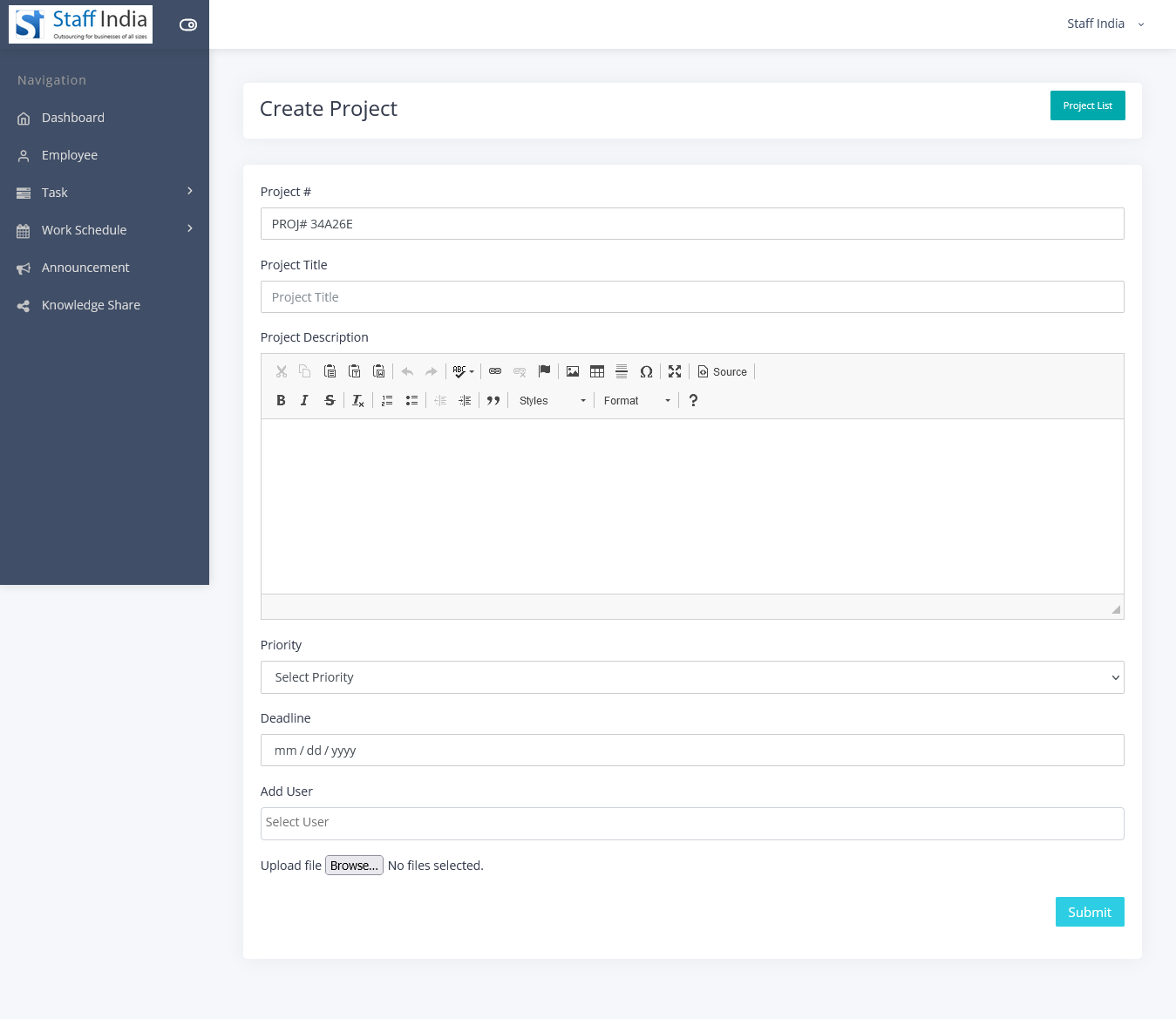 Auto generated unique project number. project title, description, priority, deadline, fileupload option, and user selection option for the project.