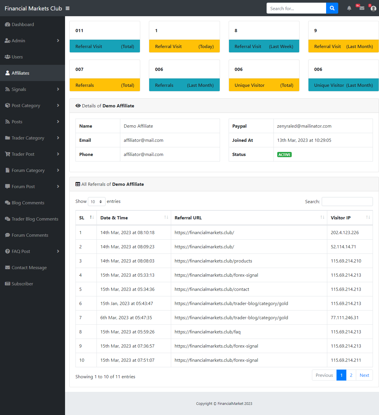 in this section we want to see a summary of all the affiliate who join. same like seeing the customer details. this should be a table only.