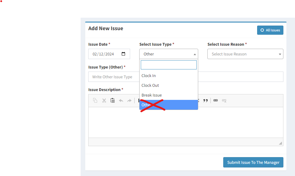 2. When one selects "Clock In" as the Issue Type, he should only see these options in the "Select Issue Reason" dropdown menu. Remove any other options available there now.