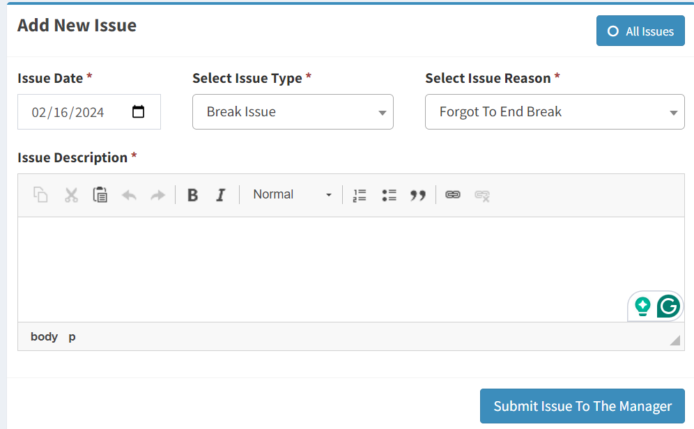 - Work Manager Unreachable (once someone selects this option, it should show a box to enter the break end time)