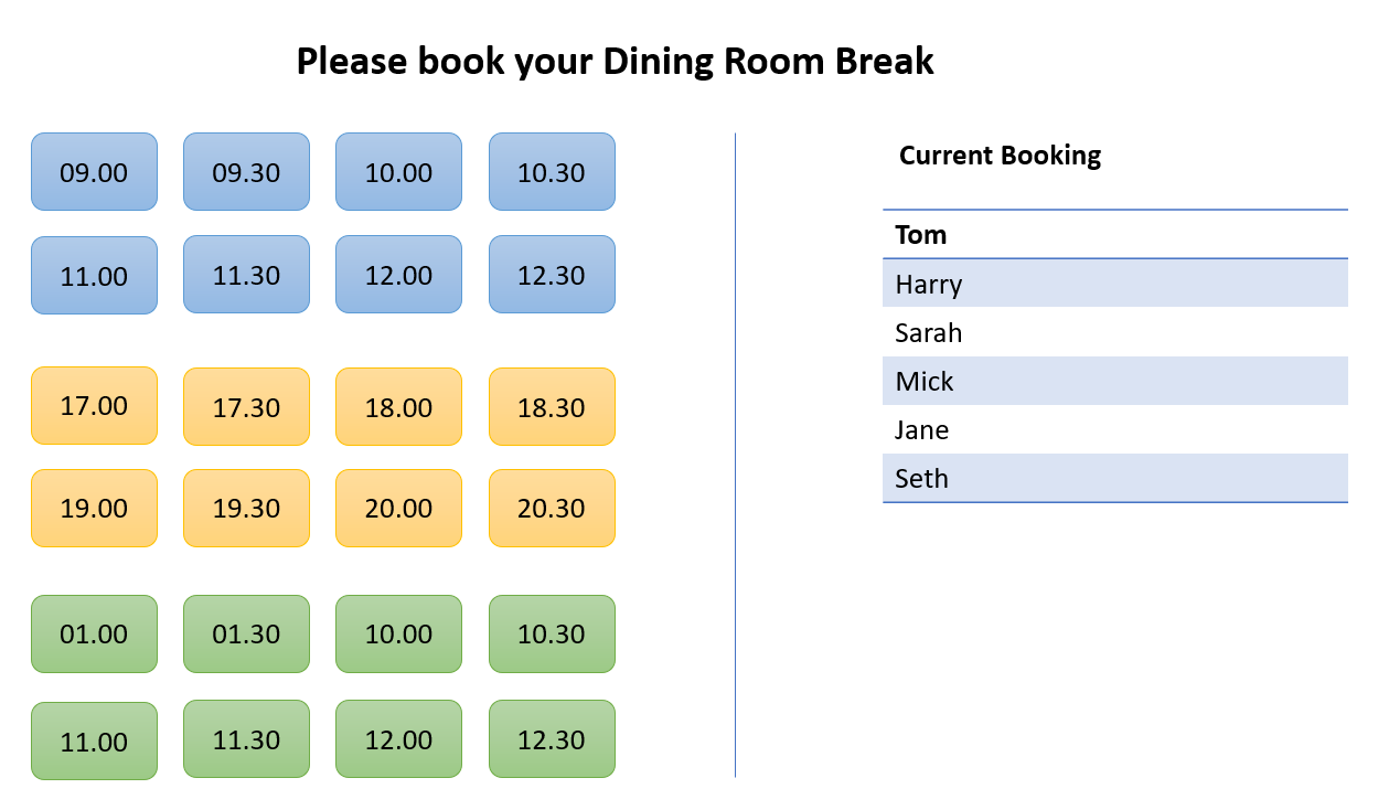 As we notice that due to growing company we need to have a booking system for having break in teh dining room. so that it remains comfortable for people to use.